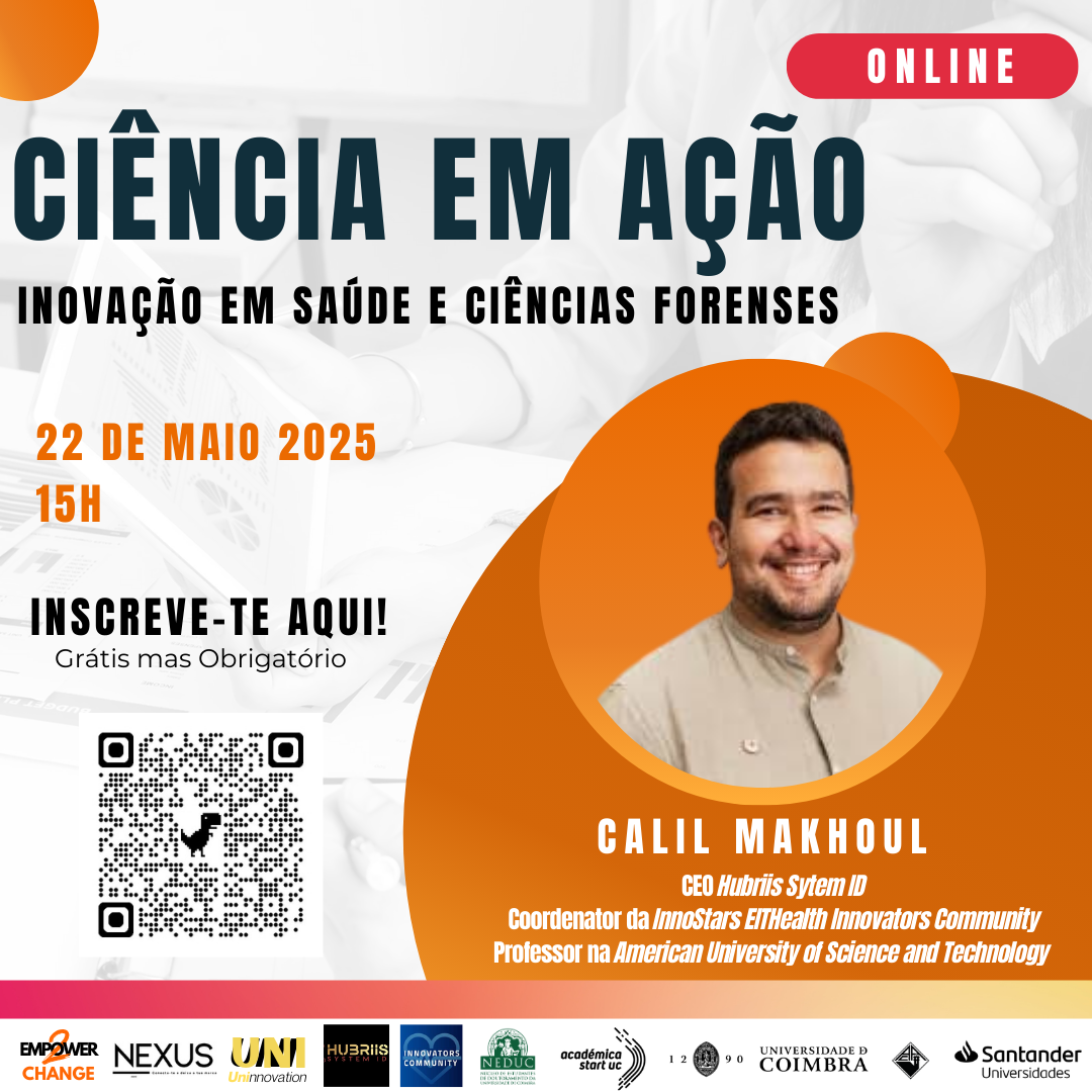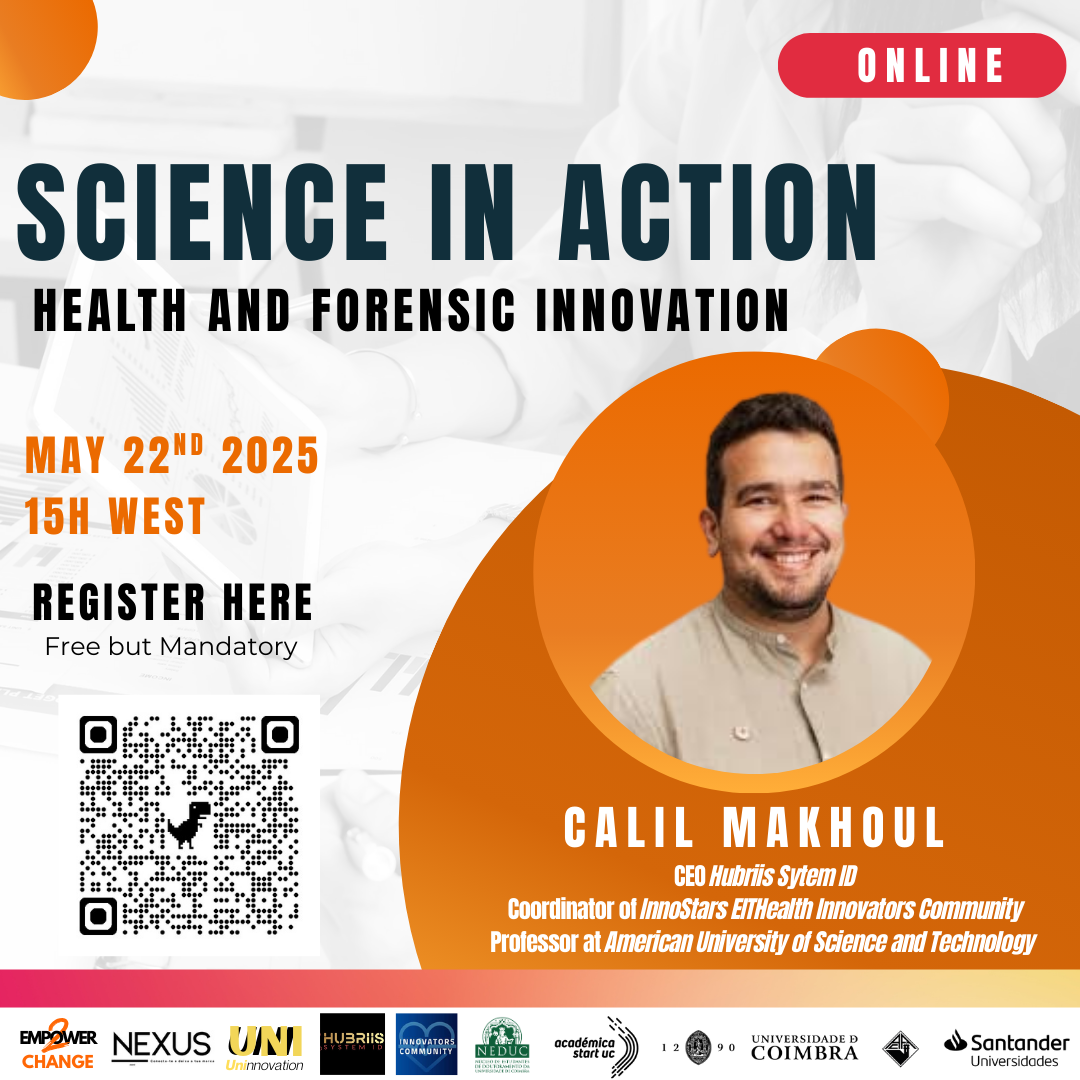 A sessão será em Inglês e será guiada por Calil Makhoul, Coordenador do InnoStars da EITHealth Innovators Community, alumni do programa Académica Start UC (4ª Edição), Antropólogo e Entomólogo Forense e Professor na American University of Science and Technology (Beirute, Líbano), onde leciona “Identificação Humana” e “Entomologia Forense”) e CEO da Hubriis System ID.