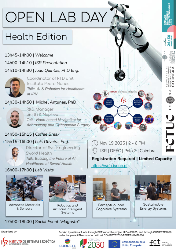 We are delighted to invite you to Open Lab Day — Health Edition , taking place on November 19, 2025 (2–6 PM) at ISR | DEEC | Polo 2, Coimbra .